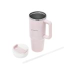 Mug doble pared, sellado al vacío con sorbete. Tecnología Vacuum. Interior en acero 304 y exterior en acero 201. Tapa plástica transparente a rosca con anillo de silicona. Cierre giratorio porta sorbete. Sorbete plástico translucido. Pintura exterior con acabado mate. Mantiene hasta 12 hs la temperatura de las bebidas calientes y 24 hs de las bebidas frías. Medidas: 8,8 cm diametro x 24 cm. Cap. 880 ml.