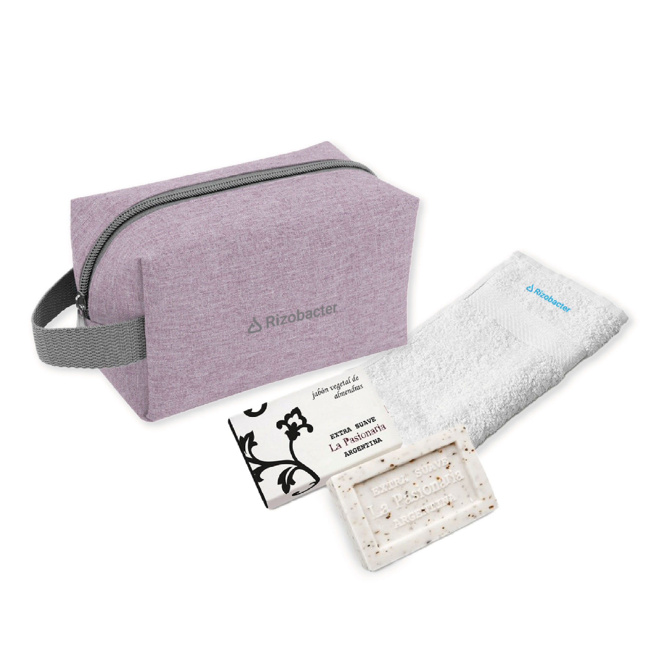 Necessaire con amplio compartimento. Interior forrado en Poliéster 210D. Cierre con tirador metálico y asa lateral en tela de color gris. Toalla de mano de 30 x 40. Jabon La Pasionaria.